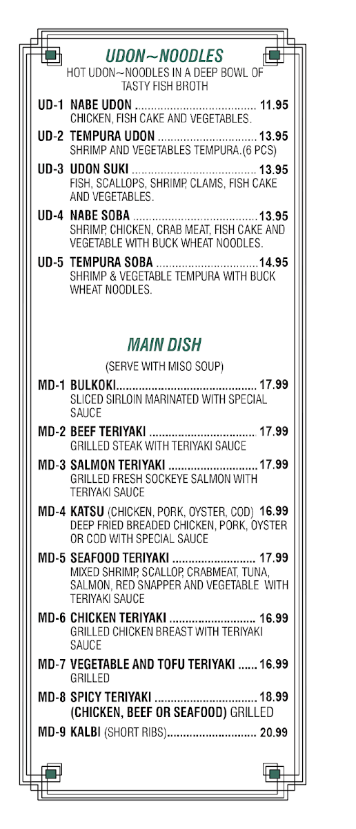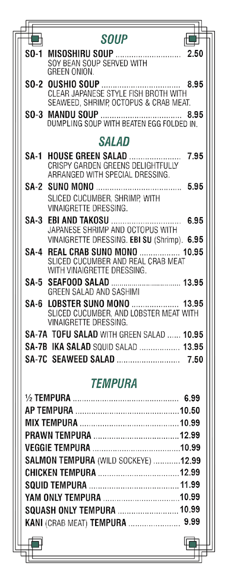 The menu at Woo Mai Sushi Japanese Restaurant Ltd offers a thoughtfully curated selection that balances traditional sushi with approachable Japanese fare. Here, you’ll find a range of fresh, carefully prepared dishes—from classic nigiri and sashimi to inventive rolls like Spicy Tuna and Fried Tuna. The menu also includes light appetizers and comforting options such as seaweed salad and bibimbap, which add variety beyond the sushi bar.